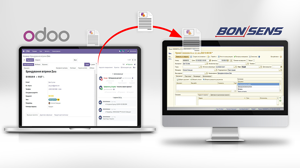 Обмін даними між Odoo та Bon Sens налаштовується користувачем та працює в обох напрямках. Усі документи (замовлення, контакти тощо), які створюються у CRM системі, завантажуються у програму, для подальшої роботи з ними.
